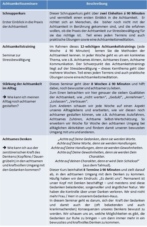 Ich biete in meiner Praxis folgende Seminare zur Achtsamkeit an: